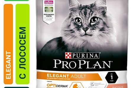 Сухой корм для кошек Pro Plan Optiderma Elegant Adult с лососем 400 г — сбалансированное питание для котов с длинной пушистой шерстью. Главный компонент корма — мясо лосося, из которого организм кошки получает необходимый для мышц протеин. Растительная клетчатка улучшает пищеварение и помогает избавиться от комочков шерсти в желудке. Витамины, такие как А, С, Е, и минералы, например селен и цинк, отвечают за здоровье и чистоту кожи, а незаменимые Омега-3 и Омега-6 жирные кислоты — за красоту шерсти: она становится блестящей, шелковистой и меньше выпадает. Хрустящая текстура гранул облегчает уход за полостью рта, мягко массируя десны и очищая зубы от налета и отложений.