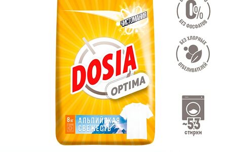 Стиральный порошок Dosia Optima Альпийская Свежесть 8кг справится с различными загрязнениями и придаст белью неповторимую свежесть. Благодаря оптимальной формуле для повседневной стирки порошок Dosia прекрасно справляется с различными пятнами, отстирывает бережно и эффективно, не повреждая волокна ткани. Придает белью приятную свежесть. Специально разработанная формула содержит компоненты для эффективного отбеливания, не содержит фосфаты и хлорные отбеливатели.