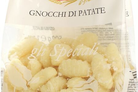 Сведения о составе: картофельное пюре 80% (вода, обезвоженные картофельные хлопья [картофель, эмульгаторы: моно- идиглицеридыжирных кислот, антиокислитель:пиросульфитнатрия,ароматизаторы]), мука из мягких сортов пшеницы типа «00», картофельный крахмал, соль, регулятор кислотности: молочная кислота, консервант:сорбиноваякислота, натуральныеароматизаторы, рисовая мука.Пищевая ценность: 157,5.2,0.4,33Условия хранения: 15,5Срок годности в днях: 365Страна изготовления: ИталияСведения об упаковке: ПакетПроизводитель: Pastificio Attilio Mastromauro Granoro S.r.l.