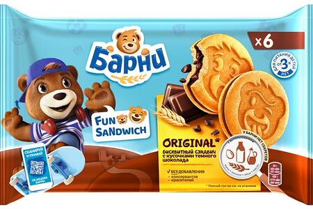 Пирожное бисквитное "Медвежонок Барни Фан Сэндвич" с начинкой, а также с кусочками темного шоколада — специально разработанное для детей кондитерское изделие в виде бисквитного сэндвича с начинкой, которое производится на основе натуральных ингредиентов: злаков и молочных продуктов. Рекомендовано для детей дошкольного возраста от 3 лет, а также придется по вкусу детям младшего и среднего школьного возраста. Благодаря веселым мордочкам на каждом бисквите этот вкусный, полезный и питательный перекус подарит заряд бодрости и хорошего настроения на целый день. Он отлично сочетается с соком, молоком, кефиром, чаем или какао, его удобно брать с собой в дорогу, давать ребенку в школу или на прогулку. Это прекрасный вариант сладкого угощения на детский праздник в школу, на день рождения. В коробке шесть пирожных. Бисквитный сэндвич "Барни" — это выбор мам, 83% мам купили бы этот вкусный десерт для своего ребенка.