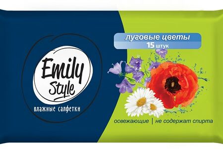 Салфетки влажные Emily Style Луговые цветы 15шт универсальное средство для повседневной гигиены по выгодной цене. Салфетки, изготовленные из мягкого, приятного на ощупь материала, эффективно очищают кожу от различных загрязнений, оставляя ощущение свежести и комфорта. Благодаря ненавязчивой отдушке они порадуют вас нежным ароматом луговых цветов. Пропитывающий лосьон без спирта и прочих агрессивных компонентов дарит коже деликатный уход, не нарушая естественный ph-баланс. Влажные салфетки выручат вас где угодно: дома, в дороге, на даче, на пикнике, на прогулке с ребенком. Компактная упаковка не займет много места в сумочке или рюкзаке. Продукция ТМ Emily Style сочетает достойное качество и доступную стоимость.