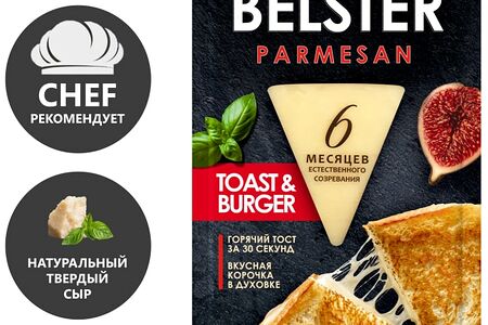 Belster Parmesan — натуральный твердый сыр. Благодаря длительному, более 6 месяцев, естественному созреванию вкус сыра становится более ярким и насыщенным, с фруктовыми нотами и чуть пряным послевкусием, а текстура приобретает характерную ломкость и плотность. Новинка в линейке — толстый слайс Belster Parmesan. Идеально подходит для горячего тоста и бургера, а также для приготовления горячих блюд в духовке — помогает создать пикантный вкус и аппетитную корочку.