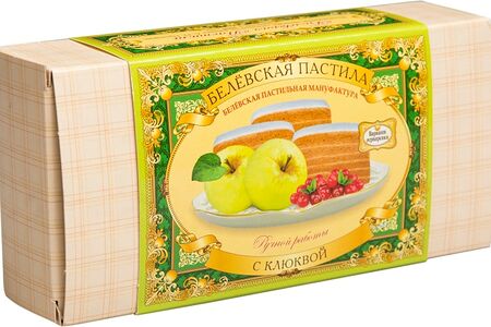 Пастила Белевская с клюквой 200г производится вручную на основе традиционного рецепта купца Амвросия Прохорова. Как и в далеком 1888 году, для ее приготовления используются только натуральные ингредиенты: яблоки сорта Антоновка, клюква, сахар и яичный белок. Душистые яблоки и спелая клюква сначала запекаются на медных противнях в дровяной печи. После остывания получившееся яблочно-ягодное пюре смешивается со взбитой меренгой. В итоге получается воздушная, ароматная и на 100% натуральная пастила без консервантов, красителей и ароматизаторов. Упакована в экологически чистый пергамент и картонную коробку.