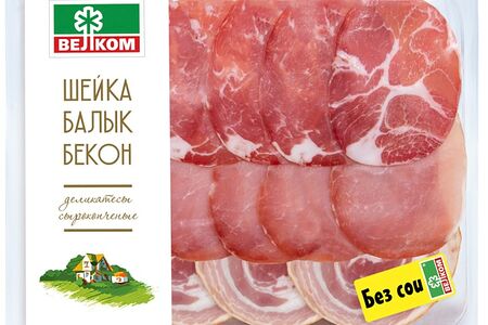 Ассорти мясное Велком Шейка + Балык + Бекон нарезка 150г идеальное решение для мясной тарелки! Это тончайшие ломтики свиной шейки, карбонада и грудинки, приготовленные по особому рецепту с добавлением специй и пряностей. Деликатесы подвергаются копчению, в процессе чего приобретают изумительный вкус и тонкий пикантный аромат. Удобный формат нарезки позволяет ускорить подачу закуски на стол. Компактную упаковку можно брать с собой на пикник, в дорогу, на работу. Соответствие европейским стандартам, новейшее оборудование, соблюдение температурных режимов в цехах, жесткие санитарные нормы, отсутствие сои и ГМО вот главные секреты отменного вкуса и высокого качества продукции Велком . В производство поступает только отборное свежее мясо, полученное от проверенных отечественных поставщиков и прошедшее строжайший лабораторный контроль.