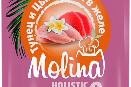 Настоящий деликатес для четвероногих гурманов из линейки Molina Holistic приготовлен на основе тунца и куриного филе. Тунец обладает высокой пищевой ценностью и положительно влияет на здоровье. Омега-3 кислоты замедляют старение, имеют противовоспалительный эффект. За счет высокого содержания белка укрепляются кости и суставы, наращивается мышечная масса, что особенно важно для животных, склонных к избыточному весу. Диетическое мясо цыпленка содержит 18–22% белков, в том числе необходимых аминокислот, при этом небольшое количество жира и углеводов. Хорошо подходит аллергикам. В составе корма только натуральные ингредиенты. За счет бережного низкотемпературного способа приготовления сохраняются все питательные и полезные вещества.