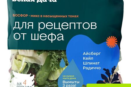 Смесь из свежих овощей Белая дача Босфор 130г – салатный микс, который поможет вам питаться правильно и сбалансированно, но при этом даст возможность сэкономить время. В его состав вошли: сочный айсберг, терпкий кейл, нежный шпинат и яркий радиччо. Ингредиенты уже трижды промыты в ключевой воде, просушены и нарезаны. Микс отлично подходит как для легких будничных, так и для изысканных праздничных салатов. Гармонично сочетается с томатами черри, оливками, цитрусовыми фруктами и ломтиками твердого сыра. Высококачественная упаковка позволяет сохранить свежесть и вкусовые свойства в пределах всего срока годности. Салатные смеси ТМ «Белая Дача» – это сочетание отменного вкуса, пользы и натуральности.