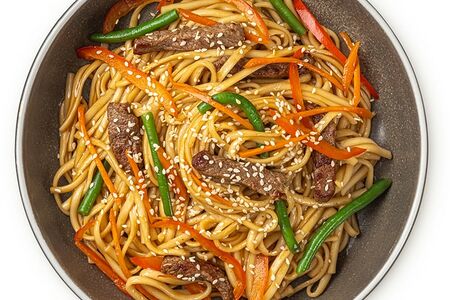 Сведения о составе: Лапша яичная отварная (вода питьевая, макаронные изделия лапша яичная (мука пшеничная, вода, яичный порошок, соль пищевая), говядина, проростки фасоли свежие, фасоль стручковая замороженная, перец красный сладкий свежий, лук репчатый свежий, стебель сельдерея свежий, соус блэк пеппер (перец черный горошком, лук репчатый свежий, чеснок свежий, соус соевый (вода очищенная, соя, пшеница, соль пищевая), вода питьевая, крахмал кукурузный, сахар), масло подсолнечное рафинированное дезодорированное, семена белого кунжутаПищевая ценность: 476,27,20,46Условия хранения: 6,2Срок годности в днях: 5Страна изготовления: РоссияСведения об упаковке: Пластиковая упаковка