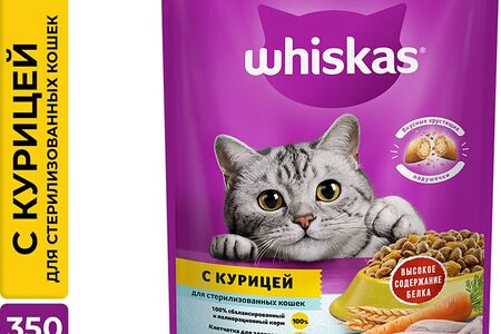 Сухой корм для стерилизованных кошек и котов Whiskas полнорационный с курицей и вкусными подушечками 350г доставка