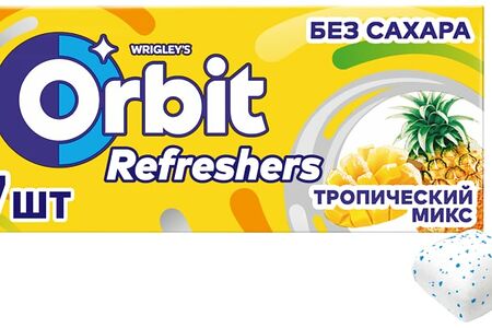 Orbit Refreshers — это кубики со вкусом тропических фруктов. Каждый кубик — это увеличенная подушечка, покрытая специальными микрогранулами для еще большего освежения с долгоиграющим и насыщенным вкусом. Жевательная резинка без сахара помогает поддерживать здоровье зубов: удаляет остатки пищи, способствует уменьшению зубного налета, нейтрализует вредные кислоты, усиливает процесс реминерализации эмали.