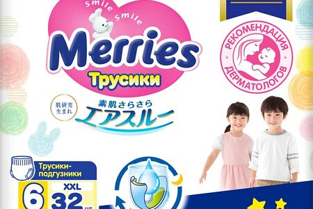 Подгузники-трусики Merries XXL 15-28кг 32шт обеспечат подросшему малышу сухость и надежную защиту от протекания на всю ночь. Трусики имеют два впитывающих слоя: первый моментально поглощает жидкость, а второй удерживает ее внутри. Крой изделий разработан с учетом анатомических особенностей ребенка, поэтому они плотно облегают паховую область, талию и ножки, но при этом не жмут и не оставляют следов на детской коже. Вся поверхность подгузника изготовлена из воздухопроницаемого материала, который позволяет испарениям выходить наружу через специальные микропоры. Шелковистый внутренний слой гарантирует непревзойденный комфорт и защиту от натирания. Эластичный поясок обеспечивает удобную посадку, но при необходимости растягивается в 2.5 раза. Когда придет время заменить трусики, две центральные полоски окрасятся в голубой цвет. Изделия легко и просто снимаются: для этого достаточно разорвать боковой шов. Простой и стильный дизайн с милым рисунком непременно понравится вашему ребенку!