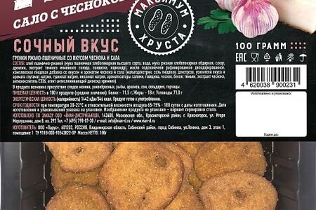 Сведения о составе: Хлеб пшенично-ржаной (мука пшеничная хлебопекарная высшего сорта, вода, мука ржаная хлебопекарная обдирная, сахар, дрожжи, экстракт темного ячменного солода, закваска, кориандр), масло подсолнечное рафинированное дезодорированное, комплексная пищевая добавка со вкусом и ароматом чеснока и сала (мальтодекстрин, соль пищевая, декстроза, усилители вкуса и аромата глутамат натрия, гуанилат натрия, инозинат натрия, ароматизаторы салями, говядина, чеснок, бекон; тимьян, экстракт чеснока, антиокислитель E306, агент антислеживающий диоксид кремния). В продукте возможно присутствие следов молока, ракообразных, рыбы, арахиса, сои, сельдерея, горчицы.Пищевая ценность: 380,11.5,5,75Условия хранения: 22,20Срок годности в днях: 180Страна изготовления: РоссияСведения об упаковке: ЛотокПроизводитель: Парус
