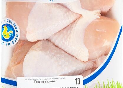 Мясо на косточке Первая свежесть куриное - это голени (нижняя часть окорочка цыпленка-бройлера) без сустава. Такое мясо - универсальный продукт, который подходит для приготовления наваристого бульона, для тушения, жарки и запекания. С ними получаются отменные рагу, чахохбили, плов, блюда восточной, кавказской, азиатской, средиземноморской, мексиканской и других кухонь мира. Голени без сустава компактно помещаются даже в небольшую посуду. Продукция птицефабрики "Элинар-Бройлер" производится из кур, выращенных на натуральном отечественном корме без антибиотиков и гормонов роста.