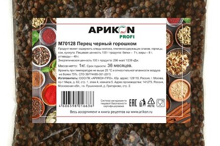 Сведения о составе: Перец черный горошкомПищевая ценность: 296,7,8,49Условия хранения: 25,0Срок годности в днях: 1095Страна изготовления: РоссияСведения об упаковке: ПакетПроизводитель: Арикон-Про