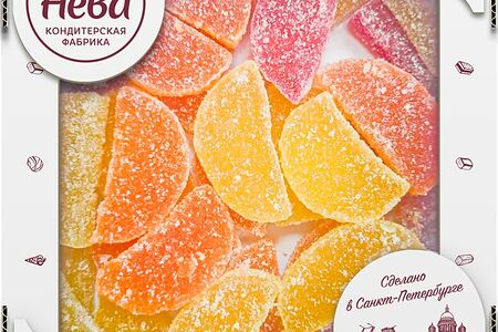 Сведения о составе: Сахар, патока, вода питьевая, агент желирующий агар, регулятор кислотности кислота лимонная, белок яичный сухой, ароматизаторы (Апельсин», Грейпфрут», Лимон», Киви»), красители (антоцианы, бета-каротин, куркумин, медные комплексы хлорофиллинов, сахарный колер III)Пищевая ценность: 360,0.1,0.1,89Срок годности в днях: 180Страна изготовления: РоссияСведения об упаковке: Картонная упаковкаПроизводитель: Нева