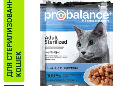 Корма в паучах (пакетиках). Полнорационный сбалансированный консервированный корм премиум-класса для стерилизованных кошек и кастрированных котов. Корм рекомендован для ежедневного кормления взрослых питомцев всех пород. Влажный корм Probalance Sterilized разработан практикующими датскими ветеринарами. Задача корма — сытно и с пользой для организма накормить питомца. Рацион приготовлен из мяса, рыбы и овощей, без приманочных усилителей вкуса и Е-консервантов. Основные ингредиенты корма и их польза: корм обогащен витаминами A, D, E, минералами и аминокислотами, способствует поддержанию веса питомца в норме. Это особенно важно для кастрированных и стерилизованных питомцев. Фитокомпозиция «Fitocare for cats» (запатентованный сбор из целебных трав) обладает общеукрепляющими, тонизирующими свойствами для долголетия кошки. В состав корма включен таурин — незаменимая аминокислота для организма кошек. Таурин отвечает за здоровье сердца и остроту зрения. Продукты, из которых приготовлен корм, имеют сертификат качества. При регулярном кормлении корм помогает питомцу быть ухоженным и здоровым.