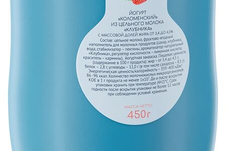 Сведения о составе: Цельное молоко, фруктово-ягодный наполнитель для молочных продуктов (сахар, клубника,вода, стабилизатор – пектины, ароматизатор натуральный «Клубника», регулятор кислотности –лимонная кислота, краситель – кармины), йогуртная закваскаПищевая ценность: 86,2.8,3.4,11Условия хранения: 6,2Срок годности в днях: 16Страна изготовления: РоссияСведения об упаковке: Стеклянная банкаПроизводитель: Коломенское