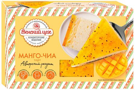 Сведения о составе: Вода, сахар, патока, масла растительные (подсолнечное, соевое), в том числе модифицированные; мука пшеничная хлебопекарная в/с, продукты яичные, молоко цельное сгущенное с сахаром (молоко нормализованное, сахар (сахароза, лактоза)), пюре из манго, масло сливочное, сироп глюкозно-фруктозный, пюре яблочное, влагоудерживающие агенты: глицерин, пропиленгликоль; крахмал кукурузный, семена чиа, загустители: пектины, агар, каррагинан; соль, регуляторы кислотности: алюмофосфат натрия кислый, лимонная кислота, цитраты натрия; эмульгаторы: моно- и диглицериды жирных кислот, лецитины (соевые), эфиры полиглицерина и жирных кислот, сорбитовый сироп; разрыхлитель гидрокарбонат натрия, консерванты: сорбат калия, сорбиновая кислота; декстроза, стабилизаторы: камедь рожкового дерева, гуммиарабик; ароматизаторы, краситель каротины, антислеживающие агенты: Е551, Е536. Продукт может содержать следы арахиса, ореховПищевая ценность: 330,2.5,14,48Условия хранения: 6,2Срок годности в днях: 40Страна изготовления: РоссияСведения об упаковке: Картонная упаковкаПроизводитель: КБК Черемушки