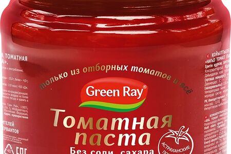 Паста томатная Green Ray Ящик Астраханских помидоров 205г – 100% натуральный и по-настоящему качественный продукт, изготовленный без добавления соли, сахара, крахмала и искусственных добавок. Отличается густой консистенцией, имеет ярко-красный цвет и насыщенный аромат. На приготовление 1 кг этой пасты уходит целых 7 кг спелых астраханских помидоров — единственных в России элитарных томатов, имеющих сертификат защиты места происхождения. В каждой столовой ложке пасты содержится суточная норма ликопина – мощнейшего из известных науке природных антиоксидантов. Продукт полностью готов к употреблению. Прекрасно подойдет для приготовления первых и вторых блюд, соусов, закусок. Без ГМО. Герметично закрытая стеклянная баночка надежно сохраняет свежесть в пределах всего срока годности.