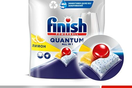 Finish Quantum All in 1 обеспечивает глубокое очищение и ослепительный блеск при каждой мойке. Компактная 3-камерная капсула эффективно справляется с различными видами сложных загрязнений даже без предварительного замачивания.