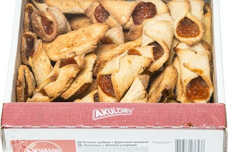 Сведения о составе: Мука пшеничная в/с, повидло яблочное (пюре яблочное, сахар, консерванты – сорбиновая кислота, диоксид серы), сахар, маргарин с массовой долей общего жира 82% (рафинированные дезодорированные растительные масла в натуральном и модифицированном виде (подсолнечное масло, кокосовое масло), вода питьевая, эмульгаторы – моно- и диглицериды жирных кислот, эфиры полиглицерина и жирных кислот; соль, ароматизатор «Сливки-молоко», краситель – каротины, регулятор кислотности – лимонная кислота), молоко сухое обезжиренное, продукты яичные (меланж), крахмал кукурузный, вода питьевая, патока, корица, разрыхлитель – карбонат аммония, соль, ароматизатор «Корица»Пищевая ценность: 401,5.9,12.2,66.9Условия хранения: 23,13Срок годности в днях: 180Страна изготовления: РоссияСведения об упаковке: Большая упаковкаПроизводитель: Акульчев