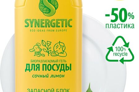 Запасной блок геля для мытья посуды Synergetic Сочный лимон антибактериальный 1л - формат, созданный для тех, кто поддерживает осознанное потребление и экологию. Упаковка рефила содержит в два раза меньше пластика и на 100% перерабатываема. У нее нет дозаторов и распылителей, для удобного использования средство нужно перелить в любой флакон с помпой. Благодаря биоразлагаемым тензидам гель хорошо пенится, устраняет любой жир и запахи. Подходит для нежной и чувствительной кожи рук, так как в составе находится растительный глицерин, защищающий от сухости и раздражения. За счет пищевого красителя тартазина гель обладает ярко-желтым цветом, а основу сочного аромата составляют эфирные масла лимона, лемонграсса и лайма. У средства есть международный сертификат Итальянского института этической и экологической сертификации ICEA. Его можно использовать для мытья посуды, овощей, детских принадлежностей и игрушек.
