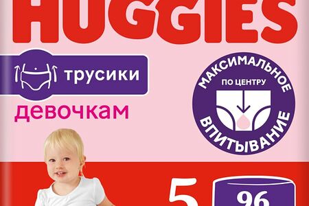Подгузники-трусики Huggies для девочек 12-17кг Размер 5 96шт с новыми героями, липучкой-утилизатором и усиленным впитывающим слоем созданы с использованием новейших азиатских материалов и технологий. В них вашей малышке будет комфортно и свободно, ничто не стеснит движения. Трусики-подгузники стали еще лучше и надежнее благодаря увеличенному впитывающему слою. Дополнительный сверхмягкий слой на пояске обеспечивает комфортную и эластичную посадку с меньшим давлением на животик, снижая риск появления красных следов на коже ребенка. В течение дня поясок адаптируется к меняющимся размерам животика, нежно обнимая его. Специальный впитывающий слой DryTouch расположен с учетом анатомических особенностей девочек (смещен к центру); он впитывает влагу за секунды, не образуя комок между ножек, и сохраняет кожу сухой днем и ночью. Мягкие эластичные резиночки вокруг ножек обеспечивают дополнительную защиту от протекания. Легко надеть — просто натяните трусики, легко снять — разорвите боковой шов. Липучка-утилизатор закроет запах на замок. Индикатор влаги подскажет, когда придет время сменить трусики. 2 замечательных новых дизайна в одной упаковке. Трусики не содержат отдушек, хлора и латекса для лучшей заботы о коже вашей активной девочки и о природе.