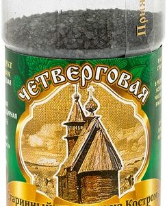 Соль черная Четверговая поваренная пищевая 140г производится по старинному костромскому рецепту. Обычная белая соль перемешивается с ржаной мукой и запекается несколько часов в настоящей русской печи. Вследствие этого процесса в ней значительно уменьшается количество вредных примесей и тяжелых металлов, она обогащается калием, кальцием, магнием, а также мелкопористым углем, который абсорбирует и выводит токсины из организма. Традиционно такую соль готовили в ночь на Чистый Четверг, а потом использовали не просто как приправу для еды, а как лекарственное средство.