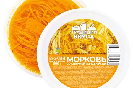 Морковь Традиции Вкуса по-корейски со спаржей 500г – готовый к употреблению салат из нарезанной моркови, соевой спаржи, чеснока, растительного масла и приправ. Морковь богата бета-каротином, который оказывает антиоксидантное действие, положительно влияет на работу мозга, повышает концентрацию внимания и улучшает память. Кроме того, корнеплод обладает противовоспалительными свойствами, снижает риск развития глазных заболеваний, способствует укреплению иммунитета. Этот аппетитный салат с приятным пряным ароматом добавит пикантные нотки в ваш рацион. Пластиковая упаковка надежно сохраняет свежесть продукта в пределах всего срока годности.