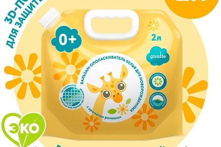 Бальзам-ополаскиватель — заключительный и важный этап стирки. Помогает качественно прополоскать бельё, придать тканям нежность и эластичность, смягчает внутренние швы детской одежды. Микрочастицы бальзама образуют 3D-покрытие, которое легко расправляет складки и делает возможным использование белья без глажения. Использование бальзама защищает белье от катышков. Подходит для стирки одежды детей с рождения, даже для одежды малышей с чувствительной кожей. Использование стирального геля Giraffe в сочетании с бальзамом-ополаскивателем продлевает срок службы одежды, постельного и нательного белья. Ускоряет время сушки в машине. Не тестируется на животных, не содержит красителей, сохраняет экосистему водоёмов.