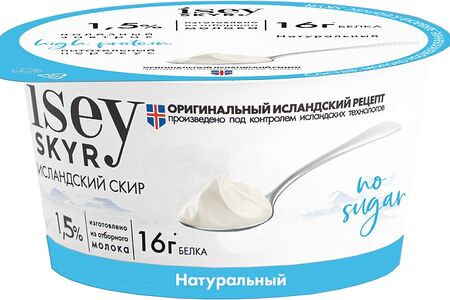 Скир Isey Skyr Натуральный 1.5% 150г уникальный кисломолочный продукт, не имеющий аналогов в России. Производится по старинному исландскому рецепту из отборного пастеризованного молока с добавлением молочной культуры Steptococus thermophilius islandicus. Isey Skyr содержит в три раза больше белка, чем традиционные йогурты. В его составе нет искусственных добавок, консервантов и растительных жиров. Обладает приятным естественным вкусом и нежной, но плотной консистенцией. Низкокалорийный скир отлично впишется в рацион приверженцев здорового питания и всех, кто следит за фигурой.