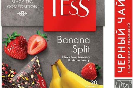 Чай черный Tess Banana Split с ароматом клубники и банана 20 пак оригинальная композиция на основе превосходного черного чая, банана и клубники. Во вкусе готового напитка доминируют сладковатые банановые ноты, а в его аромате ощущаются деликатные клубничные оттенки. Пакетированный чай выручит в любом месте: дома, на работе, в дороге. Его можно заваривать как в чашке, так и в заварочном чайнике. Опустите пирамидку в кипяток, подождите 3-5 минут и наслаждайтесь! Напиток хорош как в горячем, так и в холодном виде. Индивидуальные термосаше из фольги гарантируют исключительную свежесть и сохранение первоначальных органолептических свойств купажа. В коллекции TESS представлены как классические сорта черного и зеленого чая, так и уникальные композиции, в которых высококачественные чайные листочки идеально гармонируют с фруктами, ягодами, ароматными травами и цветочными лепестками.
