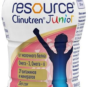Сбалансирование питание для детей Resource Clinutren Junior со вкусом клубники 200мл легкий способ обеспечить ребенка в возрасте от 1 года до 11 лет вкусным и оптимально сбалансированным питанием. В 200 мл смеси содержится целый комплекс питательных веществ, включая цельный молочный белок, витамины, минералы, жирные кислоты Омега-3 и Омега-6. Напиток придет на помощь во время интенсивных умственных и физических нагрузок, при отсутствии аппетита, в период болезни или выздоровления. А благодаря приятному клубничному вкусу он непременно придется по душе вашему ребенку. Компактную бутылочку удобно брать с собой в школу, на тренировку, на прогулку, в дорогу. В составе нет лактозы, ГМО, сои. Одна порция Resource Clinutren Junior заменяет полноценный прием пищи. Перед применением проконсультируйтесь со специалистом.