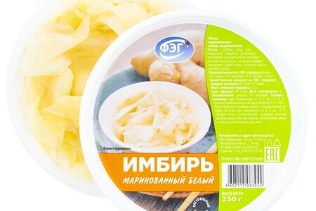 Имбирь ФЭГ маринованный 250г – тонкие, нежные и в меру острые ломтики имбиря, замаринованные без добавления красителей. Имбирный корень богат витаминами С, В1 и В2, калием, кальцием, железом, марганцем, фосфором, антиоксидантами и прочими ценными веществами. Он помогает укрепить иммунитет и быстро побороть простуду, повышает эластичность сосудов, оказывает выраженное успокаивающее и антимикробное действие. Продукт хорошо сочетается с тушеным мясом, рисом, традиционной восточной лапшой, блюдами японской кухни, рыбой. Упаковка – пластиковая баночка с крышкой. «ФерЭльГам» (ФЭГ) – это современная, динамично развивающаяся компания, которая контролирует качество своей продукции от поля до прилавка.