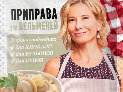 Специи от «Едим Дома» разработаны бренд-шефами кулинарных студий Юлии Высоцкой. При их создании используются только качественные ингредиенты без усилителей вкуса и консервантов. Упаковка с зип-локом обеспечивает удобное использование и хранение. Приправа подходит для пельменей, хинкали, супов. Она разнообразит привычное блюдо и подарит ему насыщенный вкус и аромат. В состав входит лук, паприка, зелень укропа, перец, чеснок, кориандр, базилик, зелень петрушки, куркума. Не содержит соли.