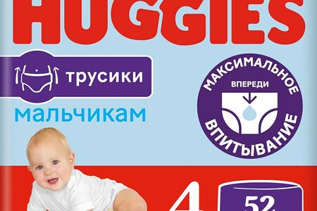 Подгузники трусики Huggies для мальчиков 9-14кг 4 размер 52шт с новыми героями, липучкой-утилизатором и усиленным впитывающим слоем созданы с использованием новейших азиатских материалов и технологий. В них вашему малышу будет комфортно и свободно, ничто не стеснит движения. Трусики-подгузники стали еще лучше и надежнее благодаря увеличенному впитывающему слою. Дополнительный сверхмягкий слой на пояске обеспечивает комфортную и эластичную посадку с меньшим давлением на животик, снижая риск появления красных следов на коже ребенка. В течение дня поясок адаптируется к меняющимся размерам животика, нежно обнимая его. Специальный впитывающий слой DryTouch расположен с учетом анатомических особенностей мальчиков (смещен вперед), он впитывает влагу за секунды, не образуя комок между ножек, и сохраняет кожу сухой днем и ночью. Мягкие эластичные резиночки вокруг ножек обеспечивают дополнительную защиту от протекания. Легко надеть — просто натяните трусики, легко снять — разорвите боковой шов. Липучка-утилизатор закроет запах на замок. Индикатор влаги подскажет, когда придет время сменить трусики. 2 замечательных новых дизайна в одной упаковке. Трусики не содержат отдушек, хлора и латекса для лучшей заботы о коже вашего активного мальчика и о природе.