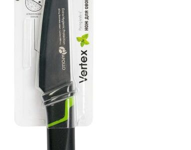 Нож предназначен для очистки овощей и фруктов, нарезки мяса, рыбы, колбас, хлеба и других продуктов. Лезвие ножа Vertex имеет стойкое покрытие, которое уменьшает контакт продуктов со сталью, предотвращая процесс окисления и помогая сохранить полезные свойства продуктов. Специальная форма рукоятки не позволяет ножу выскальзывать из руки во время использования. Материалы изготовления: нержавеющая сталь 3Cr14, пищевой пластик PP. Длина лезвия — 10 см.