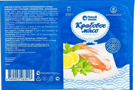 Крабовое мясо Новый океан Снежный краб 200г охлажденное кулинарное изделие из имитированного мяса морепродуктов, готовое к употреблению. Обладает приятным вкусом и сочной волокнистой текстурой. По внешнему виду имеет сходство с настоящим мясом краба. Производится из рыбного фарша (сурими) и вспомогательных компонентов по особой технологии, позволяющей сохранить в нем все ценные вещества, которыми богата рыба. Крабовое мясо источник белка, который так необходим человеческому организму. В нем мало жира, поэтому оно подходит как для диетического, так и для спортивного питания. Вакуумная упаковка надежно сохраняет свежесть, вкусовые свойства, аромат и структуру в течение всего срока годности.