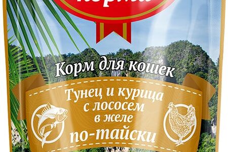 Влажный корм для кошек Родные корма Заморские Тунец и курица с лососем в желе по-тайски 70г доставка