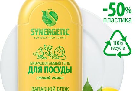 Запасной блок геля для мытья посуды Synergetic Сочный лимон антибактериальный 500мл - формат, созданный для тех, кто поддерживает осознанное потребление и экологию. Упаковка рефила содержит в два раза меньше пластика и на 100% перерабатываема. У нее нет дозаторов и распылителей, для удобного использования средство нужно перелить в любой флакон с помпой. Благодаря биоразлагаемым тензидам гель хорошо пенится, устраняет любой жир и запахи. Подходит для нежной и чувствительной кожи рук, так как в составе присутствует растительный глицерин, защищающий от сухости и раздражения. За счет пищевого красителя тартазина гель обладает ярко-желтым цветом, а основу сочного аромата составляют эфирные масла лимона, лемонграсса и лайма. У средства есть международный сертификат Итальянского института этической и экологической сертификации ICEA. Его можно использовать для мытья посуды, овощей, детских принадлежностей и игрушек.