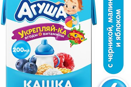 Каша Агуша Молочно-злаковая черника малина яблоко 200мл – вкусный и полезный продукт, полностью готовый к употреблению. Рекомендуется для питания детей с 6-месячного возраста. Производится на основе натурального нормализованного молока с добавлением злаков, ягод, фруктов и прочих ингредиентов. Не содержит сухого молока, консервантов и красителей. Обладает нежной консистенцией и умеренно сладким сбалансированным вкусом с нотками яблока, черники и малины. В состав кашки также входят пребиотики и витамины (В12, D3, В9), которые важны для растущего организма. Продукт удобно брать с собой куда угодно: в дорогу, на прогулку, в поликлинику или в гости. Пить можно прямо из упаковки – для этого имеется специальная трубочка.