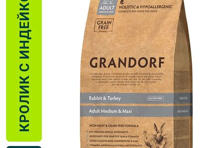 Сухой корм для собак Grandorf Adult Medium & Maxi для средних и крупных пород с кроликом и индейкой 1кг доставка
