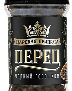 Перец Царская приправа черный горошек мельница 43г – натуральная приправа в простой в использовании и очень удобной мельничке. Получают ее из недозрелых плодов вечнозеленого ползучего растения, произрастающего в Южной и Юго-Восточной Азии. Собранные ягоды сушат на солнце, пока они не приобретут черно-коричневую окраску. Черный перец является универсальной специей, что сделало его весьма популярным практически во всех странах мира. Он гармонично сочетается с рыбой и мясом, прекрасно подходит для закусок, гарниров, домашних колбас, паштетов, соусов и маринадов. Хранить горошинки рекомендуется в герметично закрывающейся емкости в сухом месте.