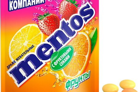 Жевательные драже Mentos "Фрукты" — это сочетание драже с фруктовыми соками клубники, апельсина и лимона в одной упаковке! Дарит уверенность в себе и вдохновляет на свежие идеи. Конфеты удобно брать с собой: компактная упаковка легко помещается в сумке или рюкзаке.