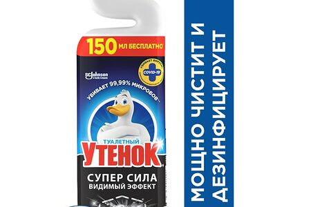 Чистящее средство для унитазов "Туалетный Утенок Гель Супер сила Видимый эффект", 900 мл. Суперэффективная формула чистящего средства для унитаза "Туалетный Утенок Видимый эффект" справляется с самыми сложными проблемами: удаляет стойкие пятна, включая ржавчину и 100% известкового налета, эффективна даже под водой. Убивает 99,99% микробов, включая вирусы, аналогичные по устойчивости SARS-COV-2, вызывающему COVID-19. Гель меняет цвет во время очищения, а значит, вы можете видеть, как он работает! Благодаря уникальной форме горлышка бутылки лучше попадает в труднодоступные места скопления бактерий под ободком унитаза. Основные преимущества: устраняет 100% известкового налета; удаляет пятна, ржавчину; меняет цвет в процессе очищения, и вы видите, как он работает; восхитительный свежий аромат без запаха хлора. Дезинфицирующий эффект в отношении исследованных микроорганизмов (E.coli, S. aureus, P. aeruginosa, C. albicans) достигается при экспозиции 30 минут. Дезинфицирующий эффект в отношении исследованных вирусов (Poliovirus, Adenovirus) достигается при экспозиции 15 минут.