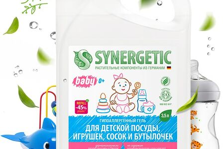 Концентрированный антибактериальный гель Synergetic – это экологичное, безопасное и эффективное средство для мытья детской посуды, игрушек, сосок, бутылочек, овощей и фруктов. Гель полностью смывается водой и не оставляет следов на поверхности. Устраняет жир и запахи даже в холодной воде. Мягкие биоразлагаемые тензиды удаляют органические загрязнения с посуды и обеспечивают хорошее пенообразование, не вызывая раздражения кожи рук. Гель для детской посуды не содержит отдушек и красителей, поэтому подходит для людей с чувствительной кожей рук. Натуральный растительный глицерин в составе геля защищает кожу рук от сухости и раздражения и обеспечивает антисептический эффект, благодаря антибактериальным свойствам. Гель для посуды сертифицирован в Итальянском институте этической и экологической сертификации ICEA и имеет международный сертификат, подтверждающий биоразлагаемость, безопасность и эффективность средства на уровне лидеров европейского рынка бытовой химии.