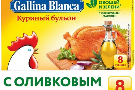 Бульон Gallina Blanca Куриный в кубиках 8шт*10г сделает ваши блюда еще вкуснее и ароматнее. В его состав входят душистые специи, свежие овощи, зелень, растительные масла, соль и настоящее куриное мясо! Хотите приготовить насыщенный бульон, наваристый борщ, золотистые щи или легкий супчик на скорую руку? Пожалуйста! Добавьте 2 кубика на 1 л воды за три минуты до готовности и забудьте о дополнительных специях и пряностях. Продукт можно добавлять не только в первые, но и во вторые блюда, например, рис, жареный картофель, макароны и даже пельмени. Gallina Blanca широко известный бренд, предлагающий богатый ассортимент бульонных кубиков, приправ, супов, соусов и пасты. Основные приоритеты производителя: высокое качество продукции, ответственное отношение к потребителям и забота об экологии.
