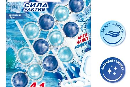 "Бреф Сила-Актив" с антиналет-эффектом — подвесной туалетный блок с формулой против известкового налета. Активная формула с антиналет-эффектом действует в 4 направлениях: образует очищающую пену, которая обеспечивает гигиеническую чистоту; предотвращает образование известкового налета; помогает предотвратить повторное загрязнение; придает туалетной комнате свежий аромат океана после каждого смывания. "Бреф Сила-Актив" придает антиналет-эффект при каждом смывании.