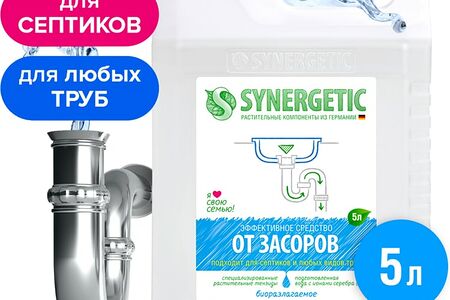 Средство для устранения засоров Synergetic 5л - эффективный концентрат для устранения любых видов засоров, в том числе в стоячей воде. В состав входит комплекс биоразлагаемых А-тензидов и кальцинированной соды. Вместе они образуют щелочную среду, в которой легко растворяются масложировые компоненты засора. Продукт быстро и безопасно устраняет неприятные запахи из канализационных труб, убивает бактерии и обладает дезинфицирующим эффектом. Можно использовать с септиком, так как оно не вредит населяющим его микроорганизмам. Экономичная упаковка сделана из перерабатываемого пластика.