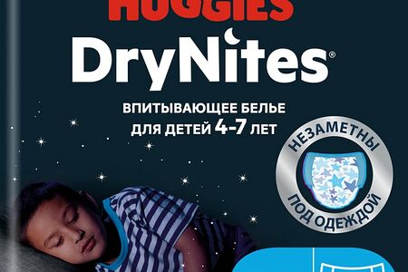 Подгузники трусики Huggies Drynites для мальчиков 4-7 лет 10шт – одноразовые трусики, предназначенные для детей с ночным недержанием (энурезом). Разработаны с учетом анатомических особенностей мальчиков, имеют 5 слоев защиты и высокую степень впитывания. Тонкие и мягкие на ощупь, они изготовлены из бесшумного и дышащего материала, а их особый впитывающий слой способен поглотить до 30% больше жидкости, чем обычные трусики-подгузники. Благодаря продуманной конструкции и эластичным вставкам по бокам они хорошо сидят и не выделяются под одеждой, а по виду напоминают настоящее нижнее белье. Немаловажное достоинство линейки – стильный дизайн, который непременно понравится любому мальчику. Теперь ваш ребенок сможет спать спокойно, а вам больше не придется вставать среди ночи, чтобы заменить ему постель и пижаму. В упаковке 10 штук. Впитывающая способность изделий: от 650 до 800мл.