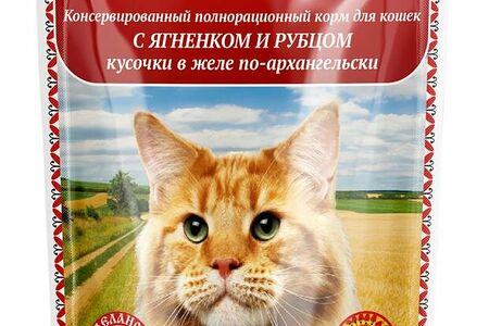 Корм консервированный для кошек Родные корма полнорационный с ягнёнком и рубцом кусочки в желе по-архангельски доставка